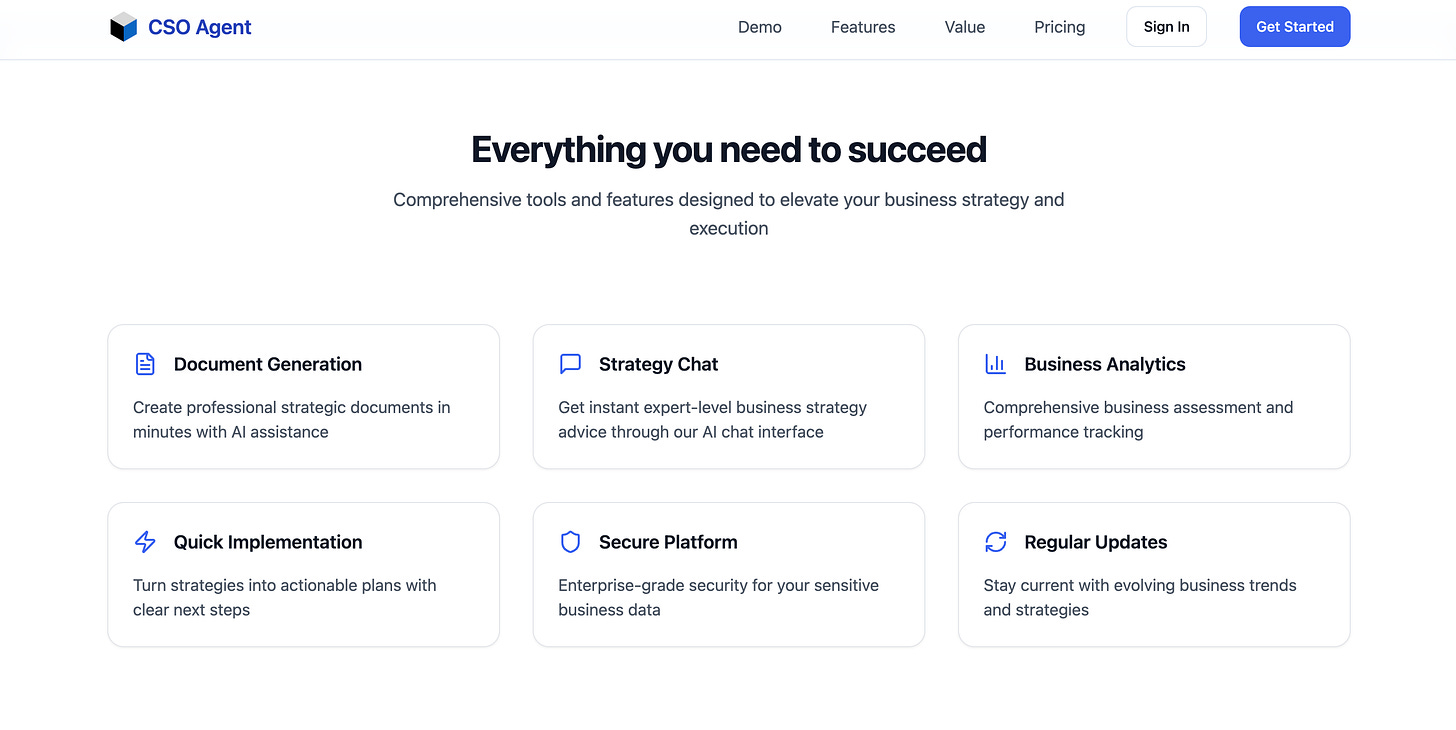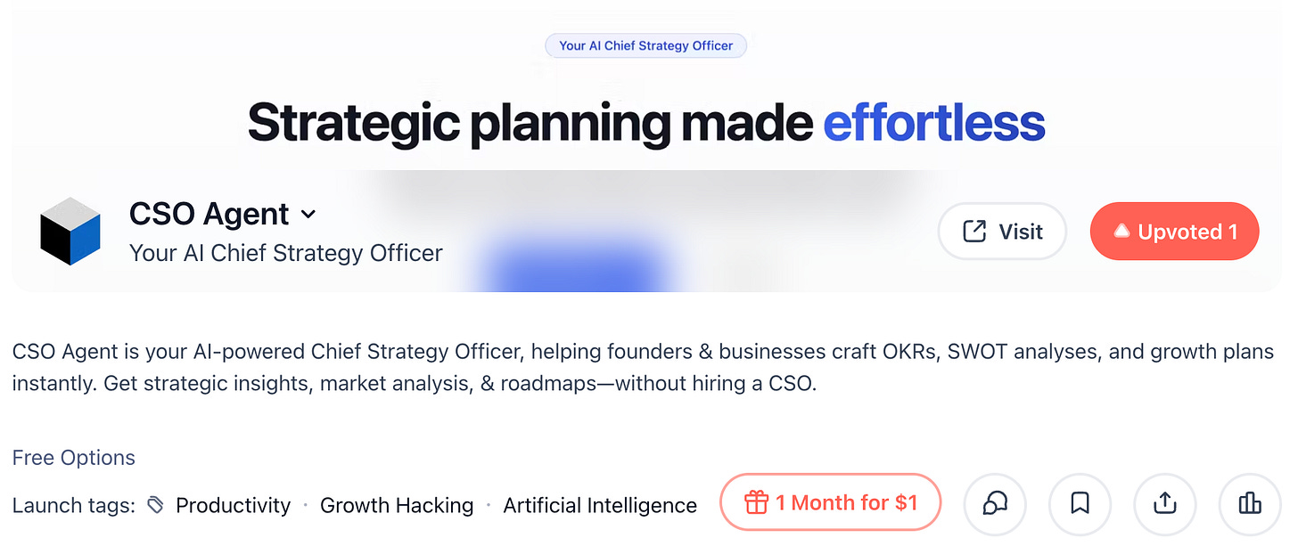 I'm excited about CSO Agent because I know what it's like to need help and not be able to afford it. For better or for worse, I've been an entrepreneur for nearly 20 years. I solo-built CSO Agent with startups, small businesses, and solopreneurs in mind because I know it’s difficult to start and grow a business. The coolest thing is that CSO Agent doesn't remove the human element from the loop completely, as people are able to click support and schedule time with me if they still want a strategy session with a human, but they would enter into the session armed with knowledge, which would save them thousands still down the line. Today, CSO Agent is live on Product Hunt, so please upvote and try it out! To celebrate, CSO Agent is available for $0.99 this month only! Click to visit the CSO Agent launch for the promo code!